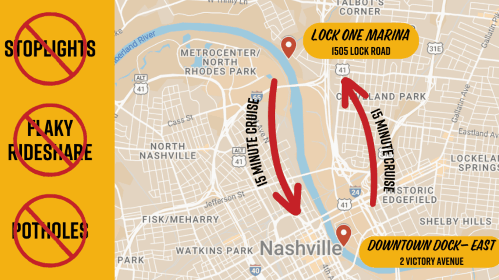 - The Departure: All water taxis depart from Lock One Marina (1505 Lock Rd, Nashville, TN 37207).